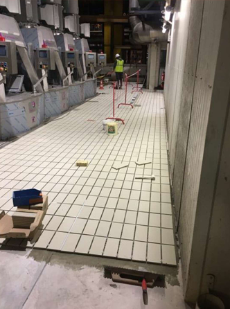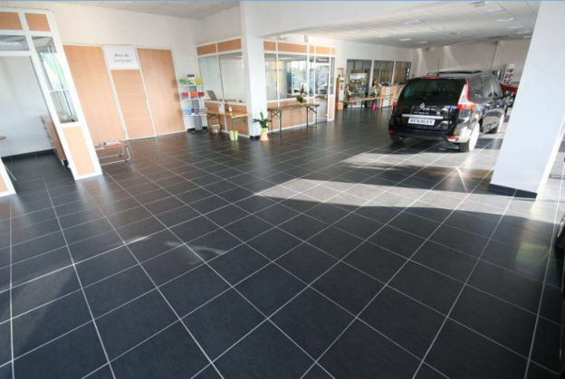 Carrelage en grès cérame 45x45cm posé dans l’ensemble du showroom, offrant une surface moderne, lumineuse et facile à entretenir.
